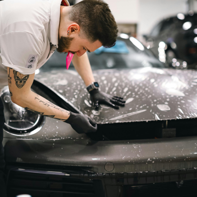 We clean the car thoroughly to remove dirt, grime, and debris so the wrap can adhere properly and won’t be compromised by contaminants.